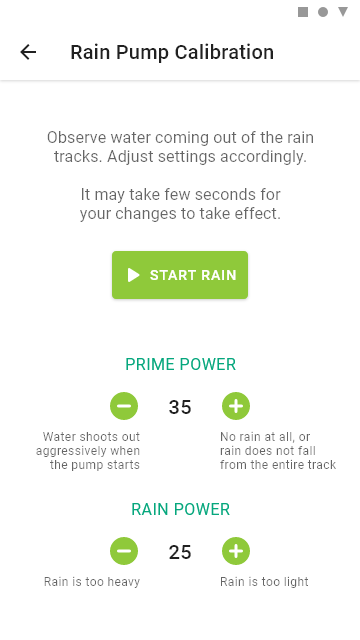 - Go to "Rain Pump Calibration" in the "Settings". Press "Start Rain" to manually start the pump.